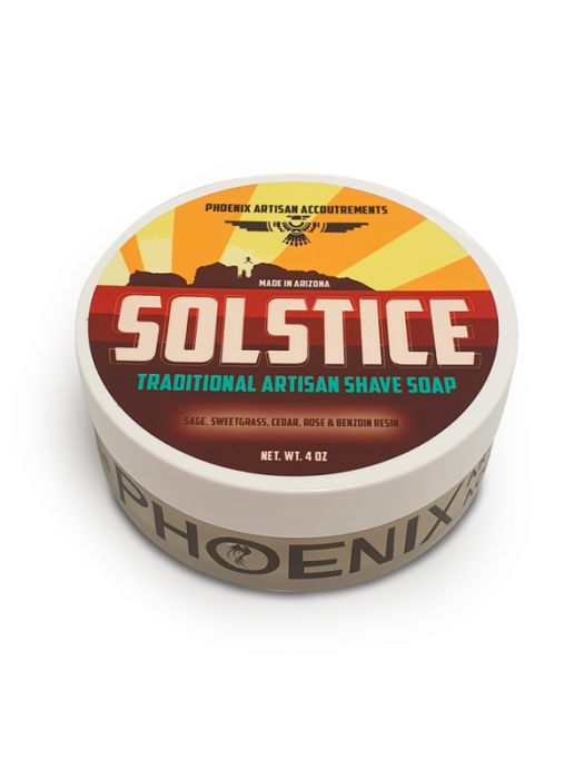 Solstice Phoenix Artisan Accoutrements Shaving Soap 113gr. Introducing a handmade shaving soap that has been specially formulated to provide you with a luxurious shaving experience. Solstice shaving soap produces a thick and rich foam that ensures maximum glide for your razor, while also providing unbeatable protection and a refreshing post-shave feeling. Made with a blend of high-quality ingredients, including saponified stearic acid, coconut oil, kokum seed butter, shea butter, and sodium lactate, this long-lasting soap is designed to give you the best possible shave. It also contains essential oils and/or fragrances to provide a delightful scent.