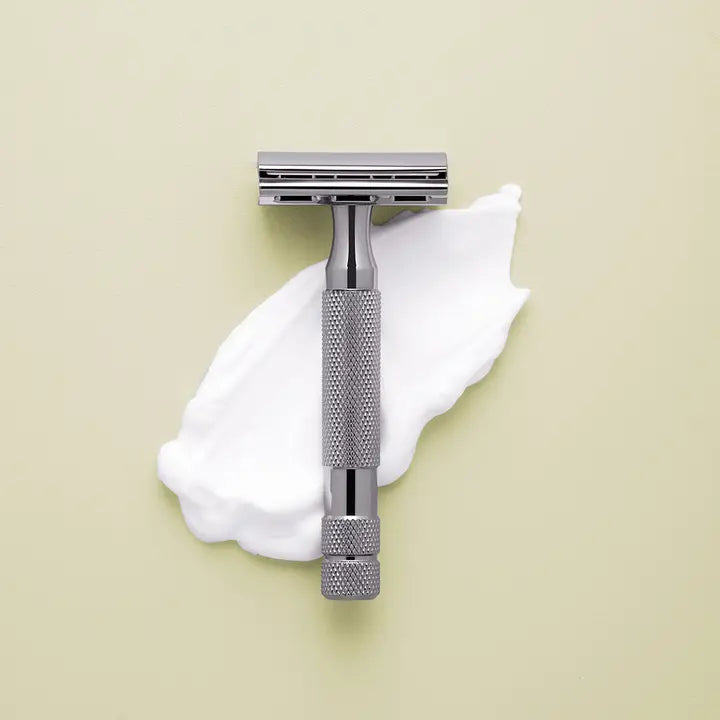 The razor is made of premium high-end chromed zinc alloys and has a striking white chrome finish. The precision-engineered blade angles provide the ultimate shaving experience.