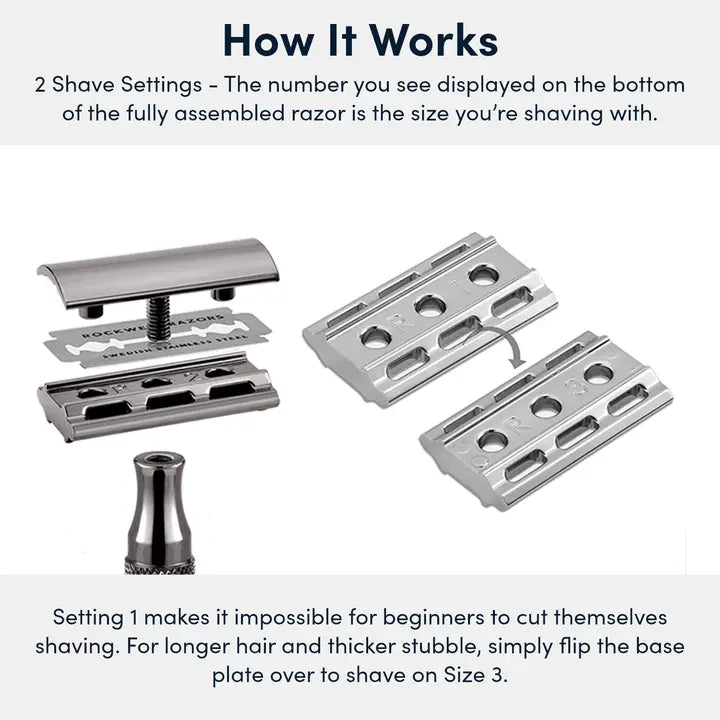 The Rockwell 2C comes with sizes 1 and 3, which are our most popular settings, making it a perfect classic razor for beginners. Size 1 is designed to prevent cuts.
