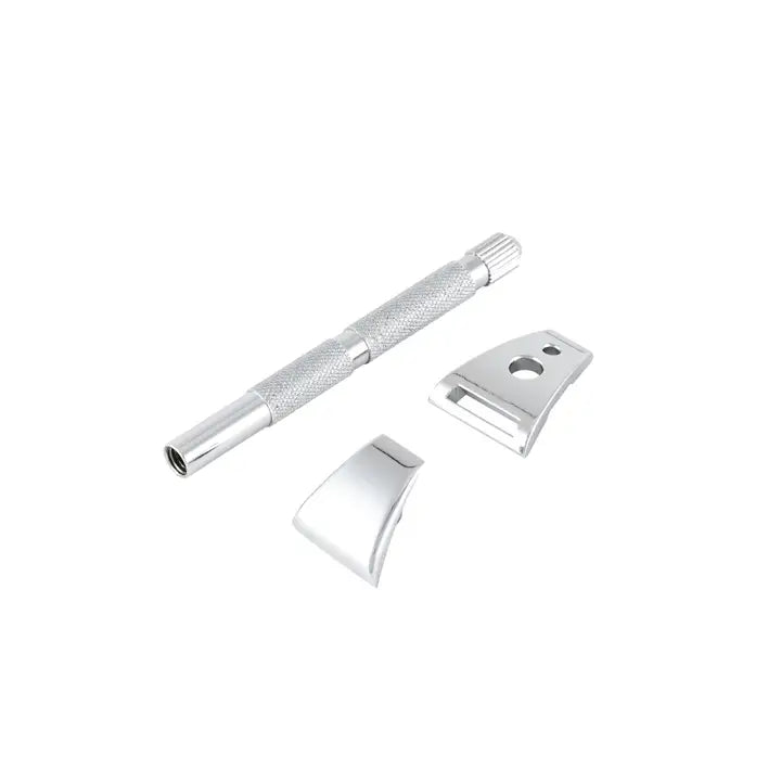 The Merkur 907 Detailing Beard & Moustache Safety Razor is designed for precise shaving in hard-to-reach areas. It has a chrome finish