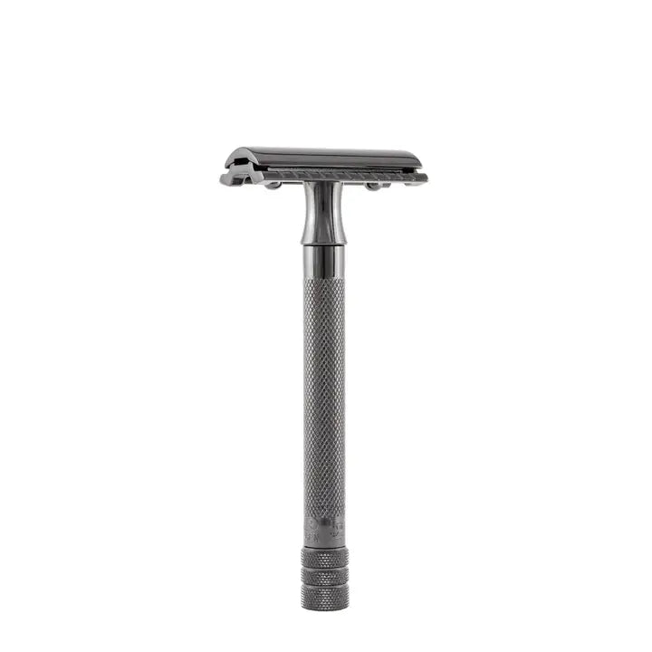 this Merkur Double Edge Safety Razor contains an extra-long handle coated with Black PVD. This 3 piece set comes with a long knurled handle which ensures a strong grip and gives you a range of movements.