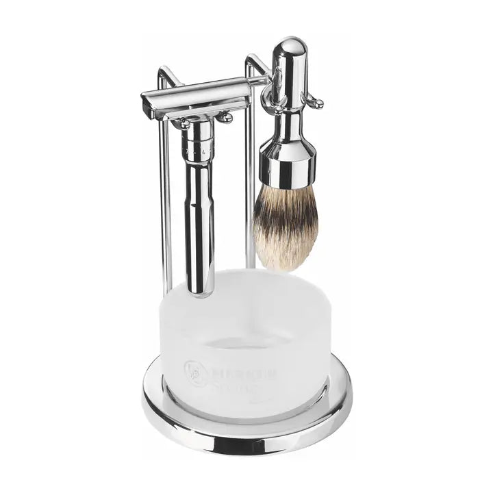 The Merkur Stand for Razor, Brush, and Soap Dish is the ultimate solution for organizing your wet shaving essentials in one stylish, space-saving unit. With a sleek bright chrome finish, this stand holds your razor, brush, and soap dish securely, ensuring that your tools are well-organized, hygienically stored, and always ready for use. A must-have for anyone looking to elevate their grooming setup with a touch of sophistication and convenience. -